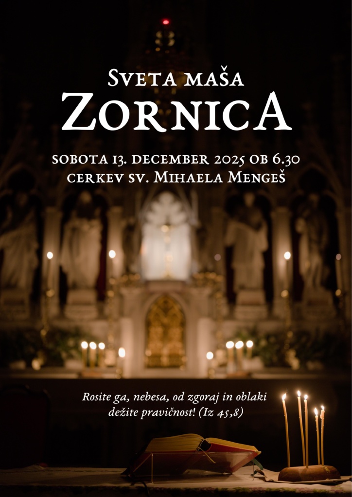 V soboto, 13. decembra 2025, ob 6.30 vabljeni k sveti maši zornici, ki jo pripravljamo v župniji. Več o mašah zornicah si lahko preberete spodaj.
