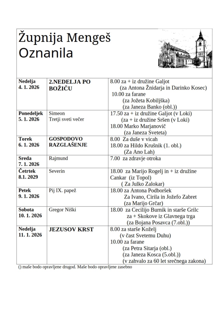 V ponedeljek se zberemo ob 17.30 pri kamnitem mostu in gremo v procesijo v loško cerkev, kjer bo sklep trikraljevske akcije. Sveta maša bo ta dan ob 18.00 tudi v Mengšu.